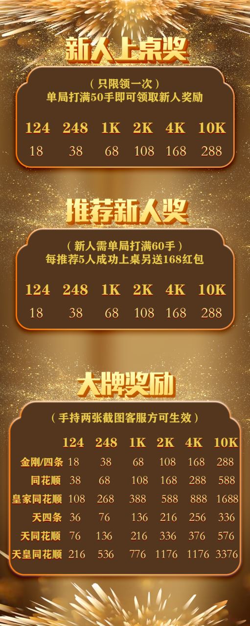 重磅新人奖,来玩即送,不仅自己可得,推荐朋友也有福利大奖! (新人奖限领一次,推荐奖可以多次叠加,推荐五人更可领取168红包) 牌型奖励均需截图,更增加天牌奖励。