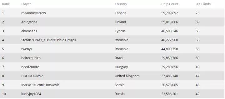 第一天比赛结束的时候,来自中国的玩家“nowwor880”筹码量暂时排名第一。刚刚结束的day2,加拿大的“ meandmyarrow”则成为了chipleader.目前比赛还剩余91人,这场比赛至少会产生2名新的百万富翁,让我们持续关注,看看谁是最终的大赢家吧。